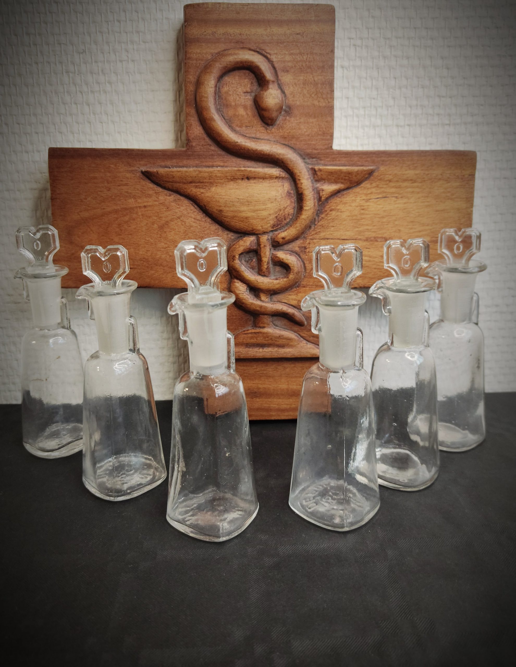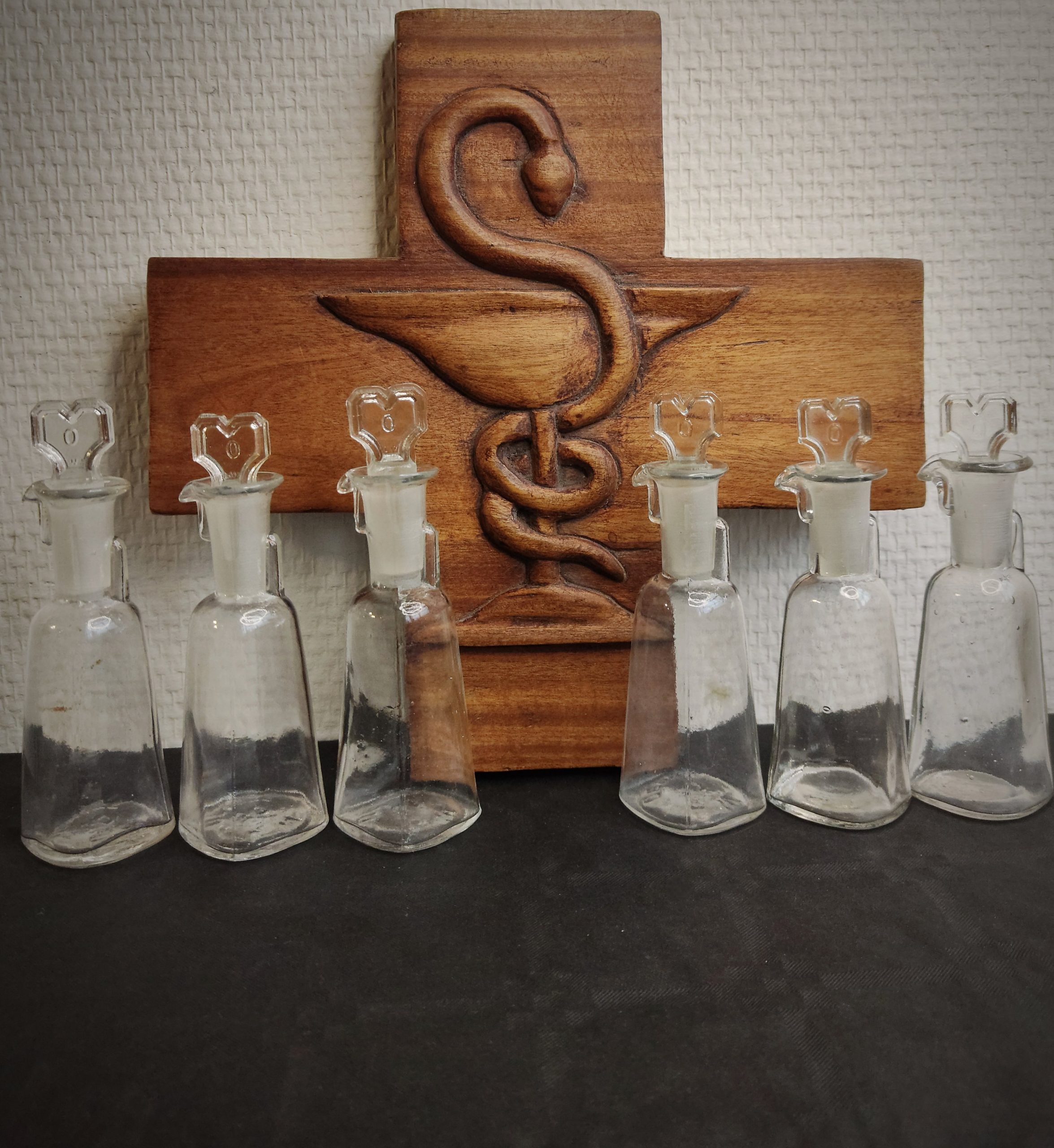 Lot de six flacons de pharmacie, fioles d’apothicaire, pots de pharmacie en verre au manganèse
