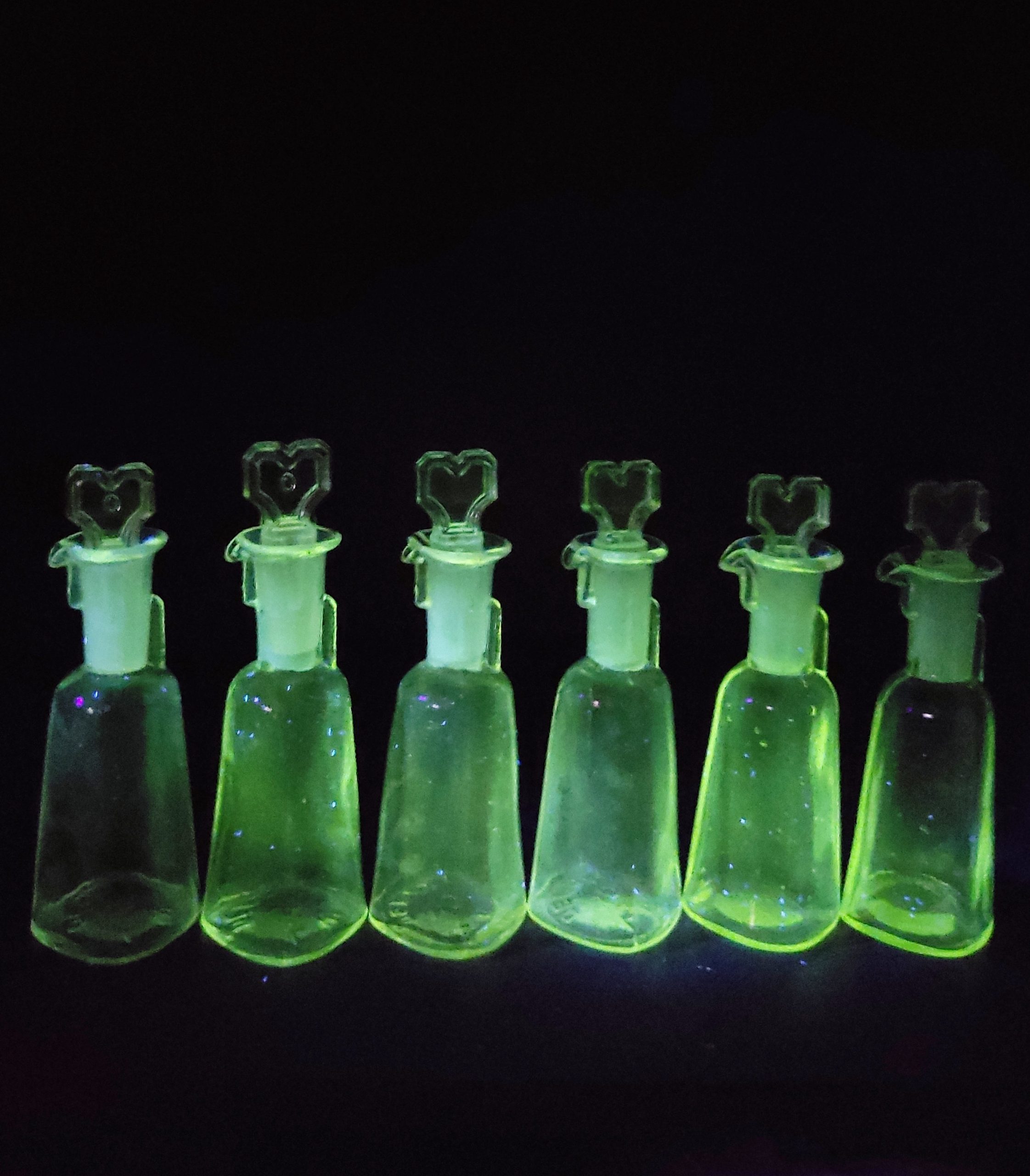 En très bon état (un miniscule éclat sur le bord d’un flacon, voir dernière photo)